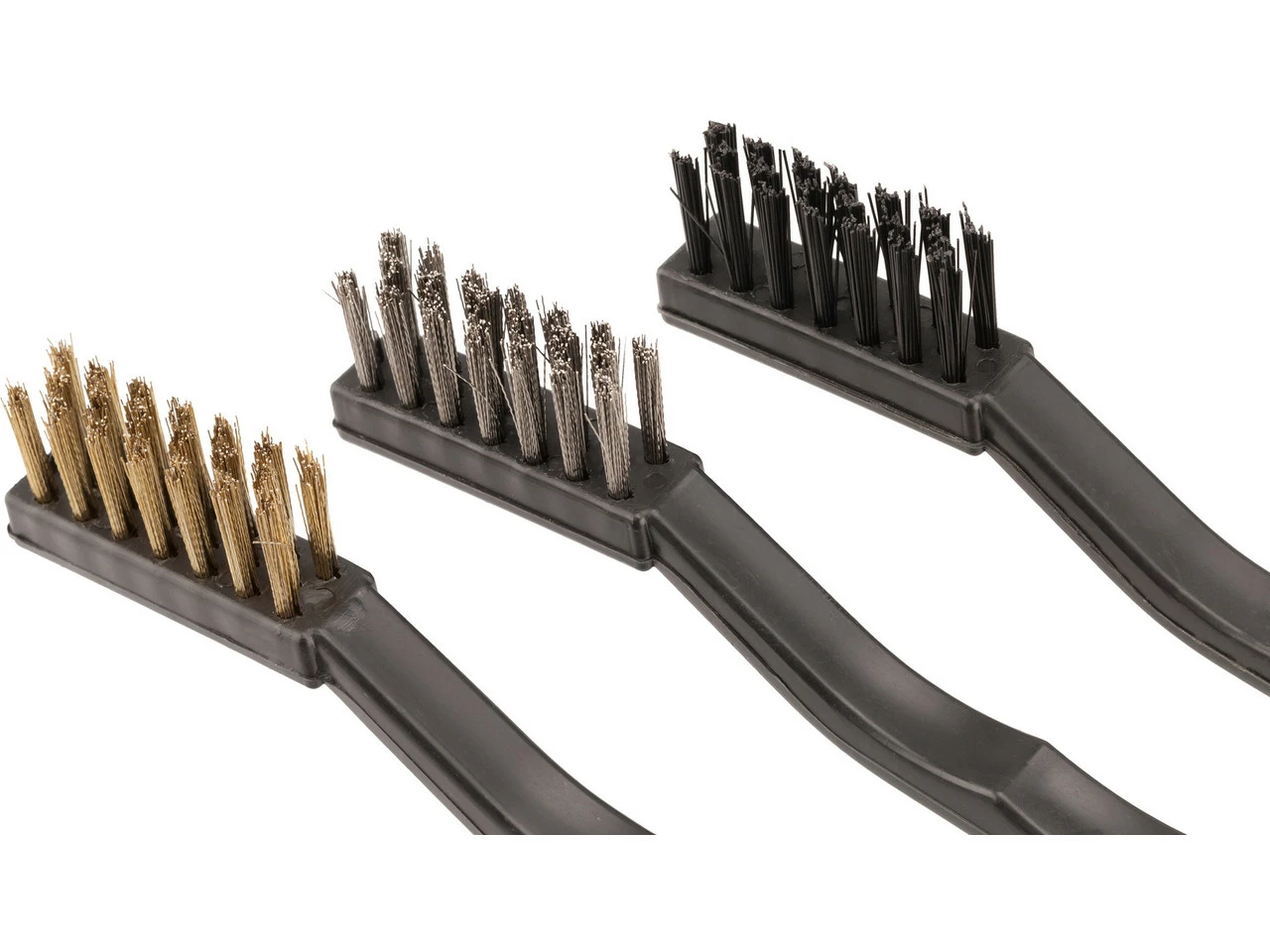 Das Bürstenset von 3min19sec umfasst drei Bürsten, mit denen Du leichte Oberflächenbearbeitungen und Reinigungsarbeiten am Rad durchführen kannst. Jede Bürste ist 120 mm lang und verfügt über einen ergonomisch geformten Kunststoff-Griff. Wie an den drei verschiedenen Borsten-Farben (gold, silber, schwarz) zu sehen ist, liegen drei unterschiedliche Materialien vor. Du erhältst also eine Messing-Bürste, eine Stahl-Bürste und eine Kunststoff-Bürste alle in einem Set. Dabei ist die Stahl-Ausführung die härteste, die Messing-Version mittelhart und die Kunststoff-Ausführung die weichste.