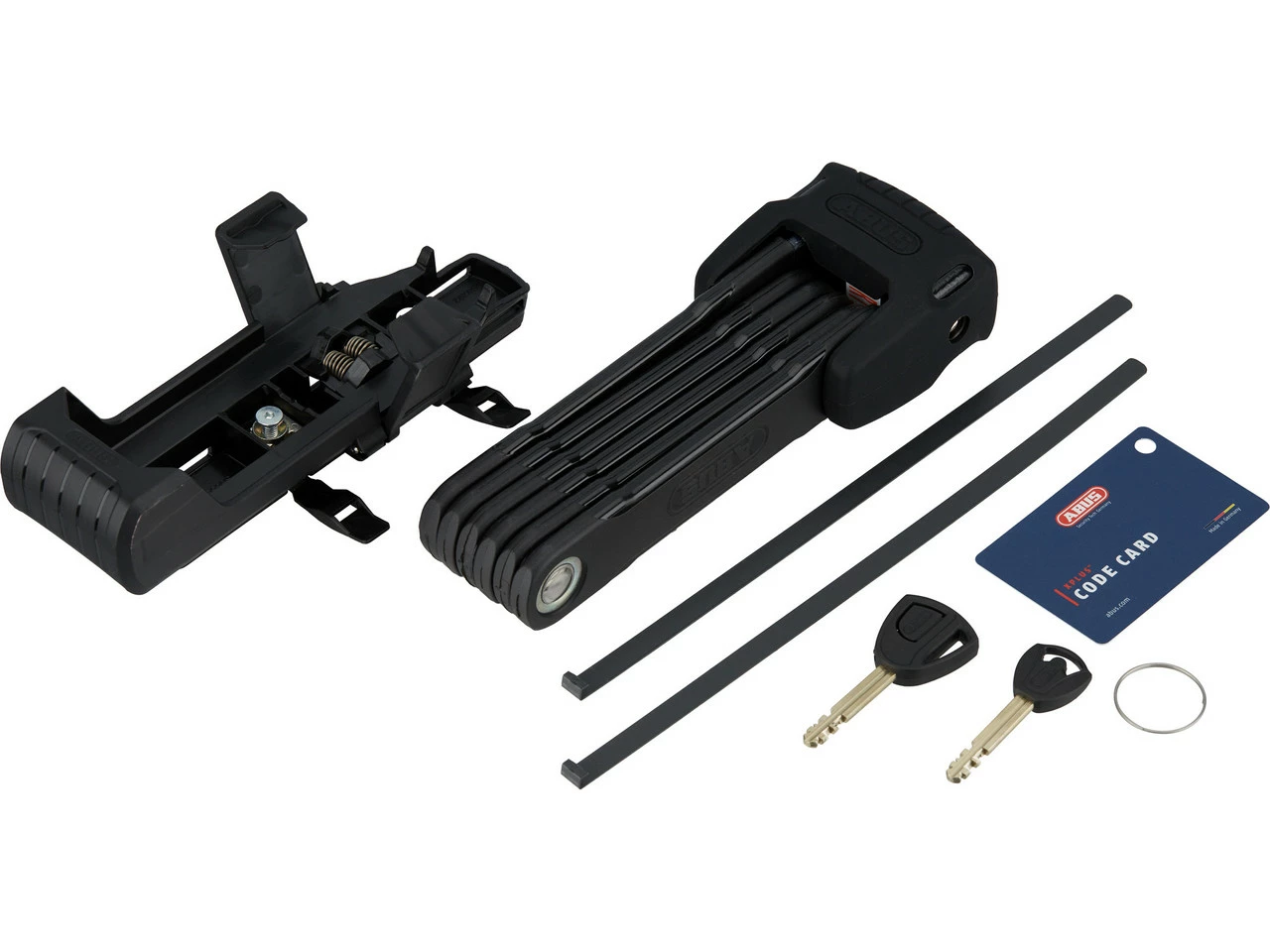 Lieferumfang:1 x Faltschloss ABUS Bordo Granit 6500K1 x Halter ABUS SH1 x Spanngurt2 x Schlüssel1 x ABUS XPlus Code Card