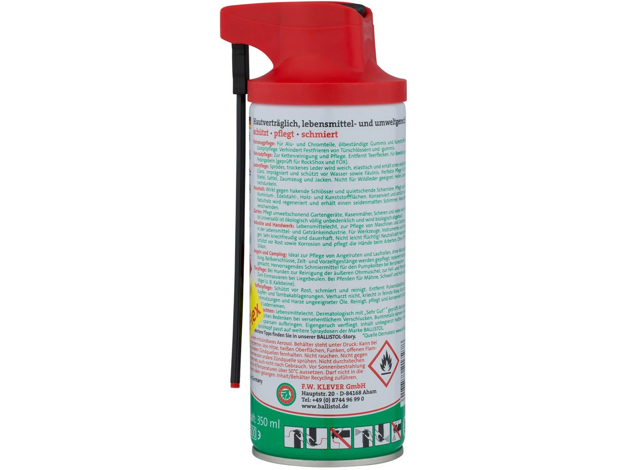 Spezifikationen:Bezeichnung:Ballistol Universalöl-SprayAnwendungsbereich:Reinigungsmittel, Schmiermittel, ImprägnierungFeatures:kann variabel von Flächenstrahl auf Punktstrahl umgestellt werdenflexibler Kapillarschlauch mit dem alle Ecken und Winkel erreicht werdenpunktgenaue Dosierung möglichverharzt nichtideal zum Einwintern und Restaurierenkorrosionsbeständigschützt Schlösser vor dem EinfrierenKennzeichnung nach CLP-Verordnung:
